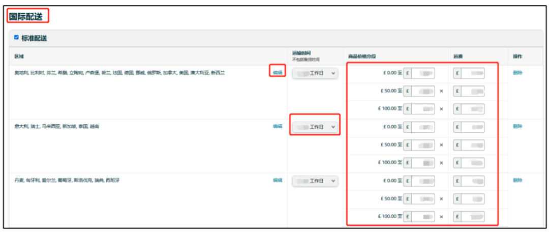 ◆ 在【国际配送】下,为标准配送和加急配送选择运输时间和运费,为您要参加出口计划的国家创建新的配送模板,点击【保存】