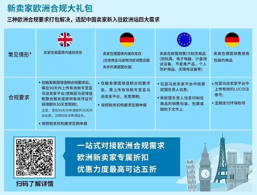 亚马逊推出新卖家欧洲合规大礼包,一站式解决增值税VAT问题,生产者责任延伸(EPR)要求,以及带有CE标志的商品在欧盟销售的合规要求。还为新卖家提供欧洲新卖家专属折扣,优惠力度最高可达五折。