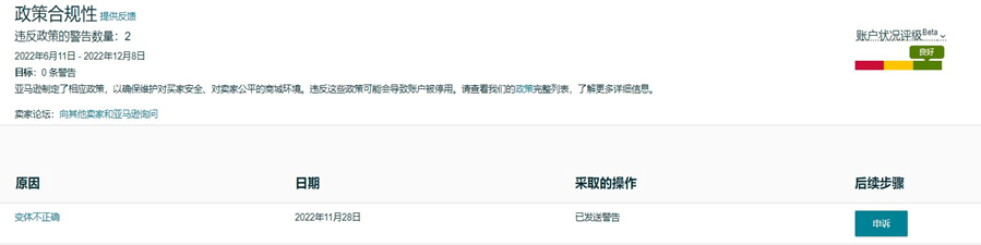 商品详情页面违规通常被标记后会显示在“政策合规性”下的“违反政策警告”里。