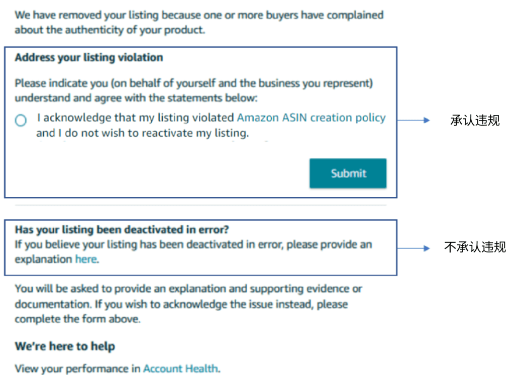 在违规ASIN旁边,点击“申诉”按钮后,勾选承认违规的选项,进行提交。