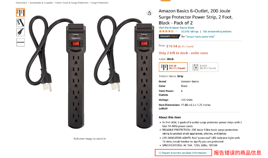 在商品详情页面上找到“报告错误的商品信息”的通道,如下图所示: