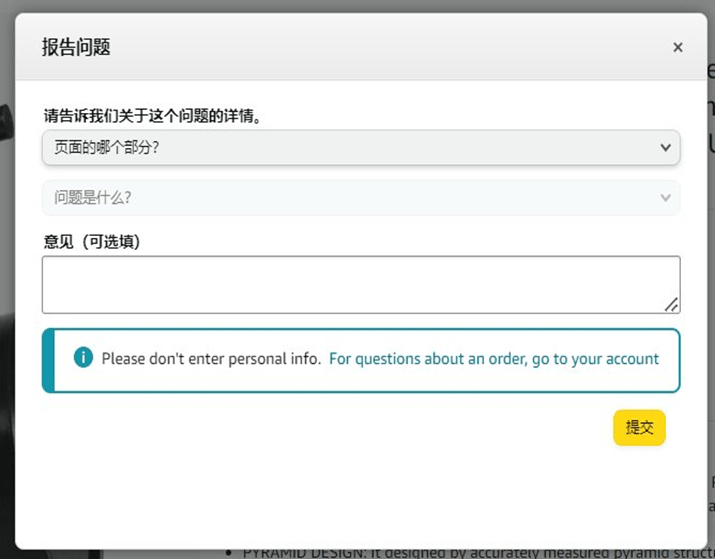 点击“报告错误的商品信息”后,可看到“提告问题”的窗口,请在窗口上填写问题的详情,以及意见,最后点击“提交”