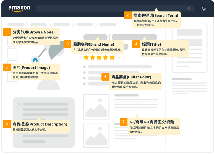 亚马逊商品详情页面展示了商品的所有独立信息,其中包含了八大要素:分类节点、关键词、图片、标题、商品要点、商品描述、A+页面、品牌名称。