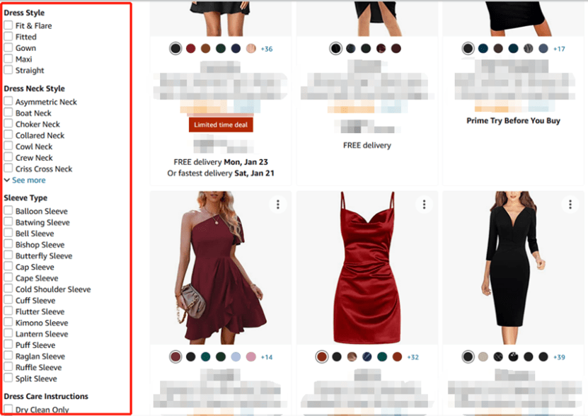 第一,在搜索结果页面的最左侧,亚马逊为用户提供了更加细分的搜索选项,在填写了选填属性后,您的产品就会在选定后的搜索结果页面中显示,带来更大流量。