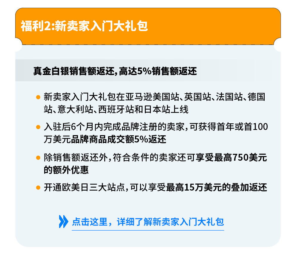 针对新品牌所有者的品牌销售额,新卖家入门大礼包中的5%返还将会首先生效,卖家可在享受新卖家入门大礼包的5%的销售额返还之后,再通过亚马逊物流新品入仓优惠计划享受其中的新选品销售额(平均10% )返还:对于完成品牌注册的品牌所有者,对符合要求的亚马逊物流(FBA)新父ASIN销售额将按月获得5%的销售额返还。