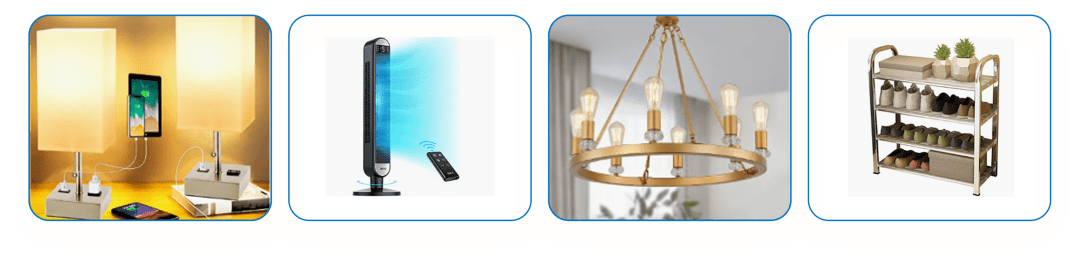 ● 热销产品举例:台灯、塔式风扇、天花板吊灯、落地灯、梳妆台灯具、独立式鞋架及衣架