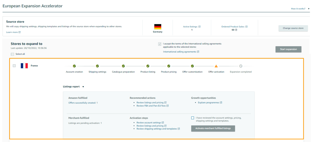 此时,FBA商品在新站点已处于活跃状态,无需操作。卖家只需在新站点中查看账户设置、商品目录和定价、运输设置和模板等。MFN商品需要卖家手动激活,拓展完成后还可查看自定义列表报告。