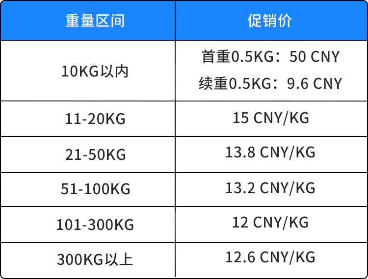 注:*10公斤以内货物,以单票单件方式计费,即以单箱为基准使用上述首重+续重方式计费。