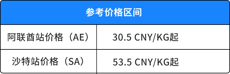 注:报价供参考,根据汇率变化、是否提货、是否带电、是否敏感货等因素影响浮动区间。SEND 中东站空派产品报价含提货费+空运费,其他税费及其他杂费含在空运运费。