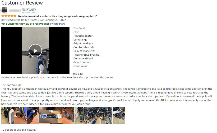 为了快速破冰,小牛在亚马逊开店之初便在北美和欧洲站点集中做了一场新品上市营销战役——在亚马逊站外,小牛与社交媒体上极限运动、电动滑板车等专业领域的KOC进行合作投放,引起声量关注,并导流到亚马逊店铺;在亚马逊站内,小牛为6个ASIN全部使用了Vine计划,并充分利用了每个ASIN能有30个产品注册Vine计划的上限,短时间内便收到了约150条图文并茂的高质量点评。因为产品过硬,许多Vine Voice社区评论者拍摄了试用视频,专业详尽地表达了愉快的产品体验。