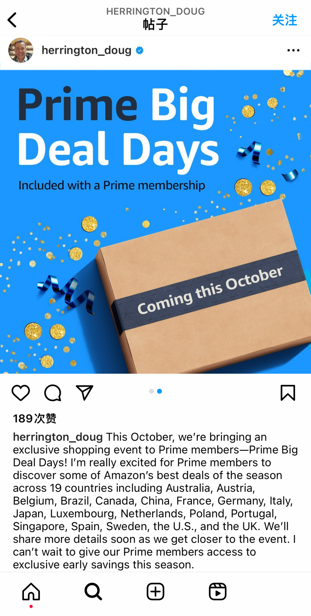 亚马逊于今日宣布,将在今年10月为亚马逊Prime会员带来“Prime会员大促”。19个国家(包括澳大利亚、奥地利、比利时、巴西、加拿大、中国、法国、德国、意大利、日本、卢森堡、荷兰、波兰、葡萄牙、新加坡、西班牙、瑞典、美国和英国)的Prime会员将在亚马逊网站上发现更多当季的优惠商品。