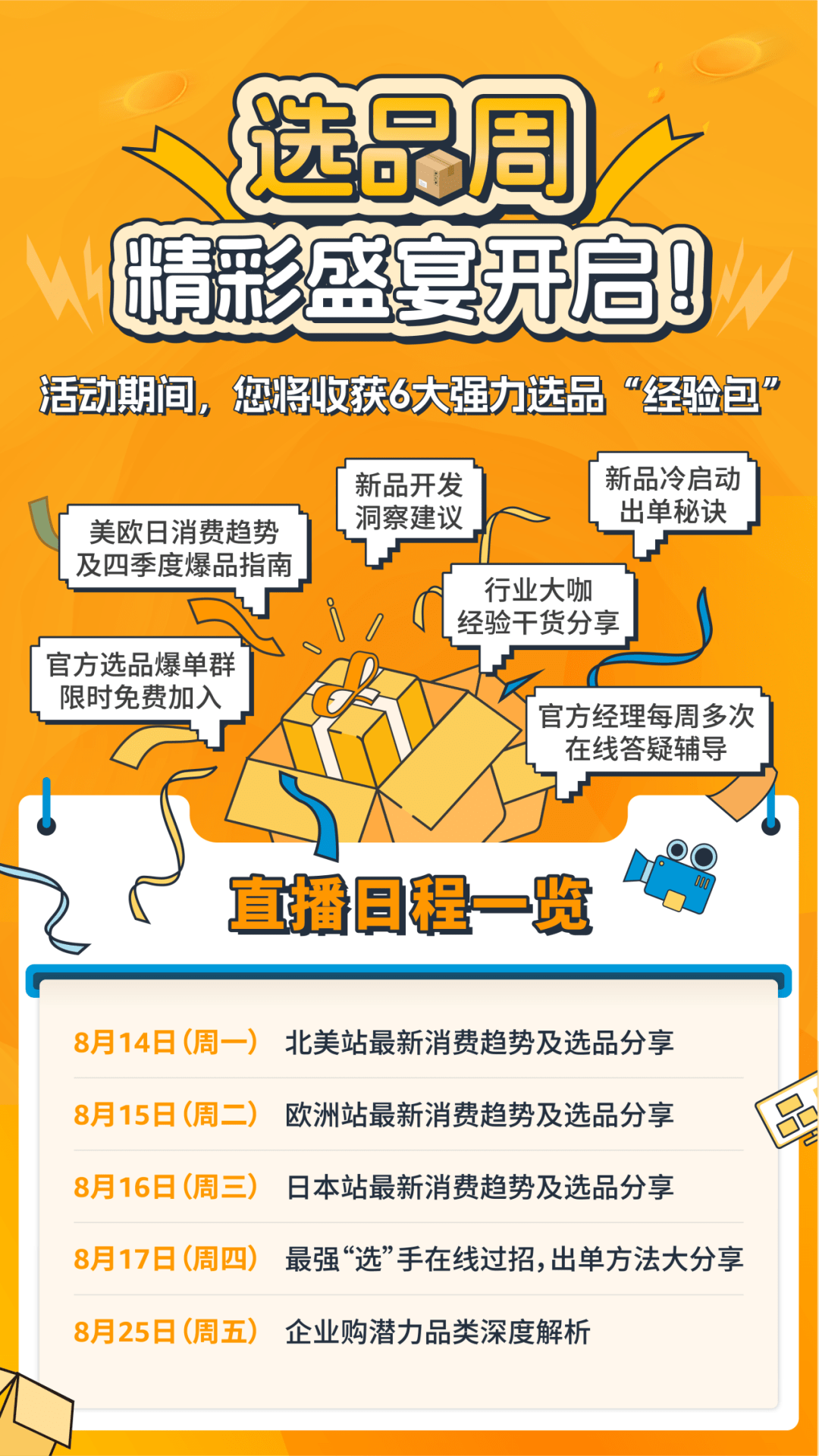 想要年底大促再次赶上爆单末班车?想强势入股选品“香饽饽”,新品出单停不下来?为帮助各位卖家朋友们抓住下半年时间进一步挖掘爆品,助力新品开发,做好明年选品准备,亚马逊全球开店带来了史无前例的选品周活动!准备好了吗?提升“选品力”一起Go!