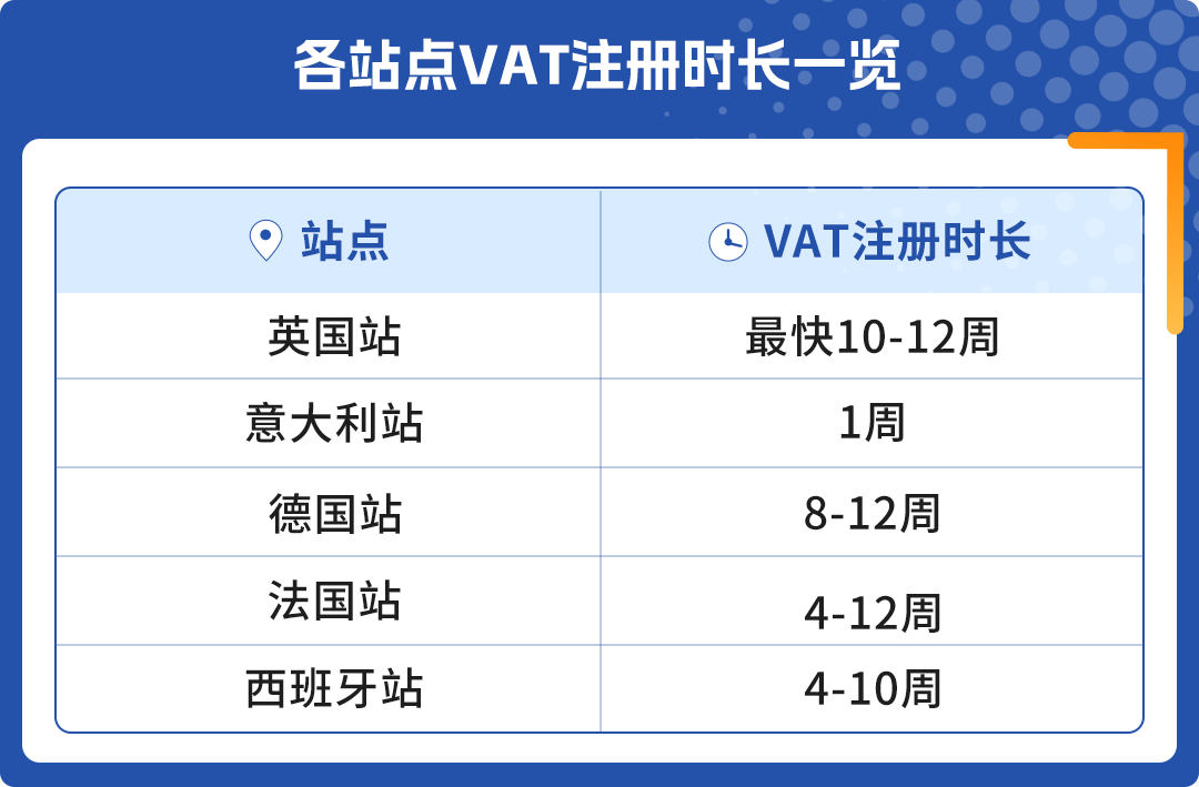 在欧洲站有库存产生的地区,就要注册有效VAT税号,比如,如果您在德国和英国分别FBA入仓,就需要注册德国站和英国站的VAT税号。您可根据下方各国家/地区VAT税号平均注册时长 ,提前做好合理的时间规划,有助于让商品尽早合规上线开售。