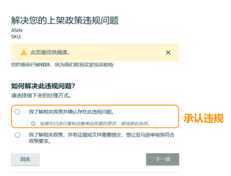 “Wrong Item(收到错的产品)”承认违规界面示例👆