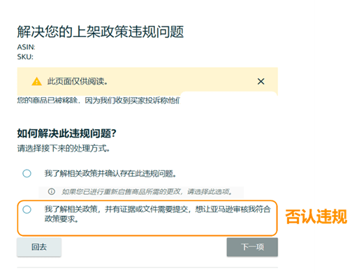 “Used Sold as New(二手商品当作新品销售)” 否认违规界面示例👆
