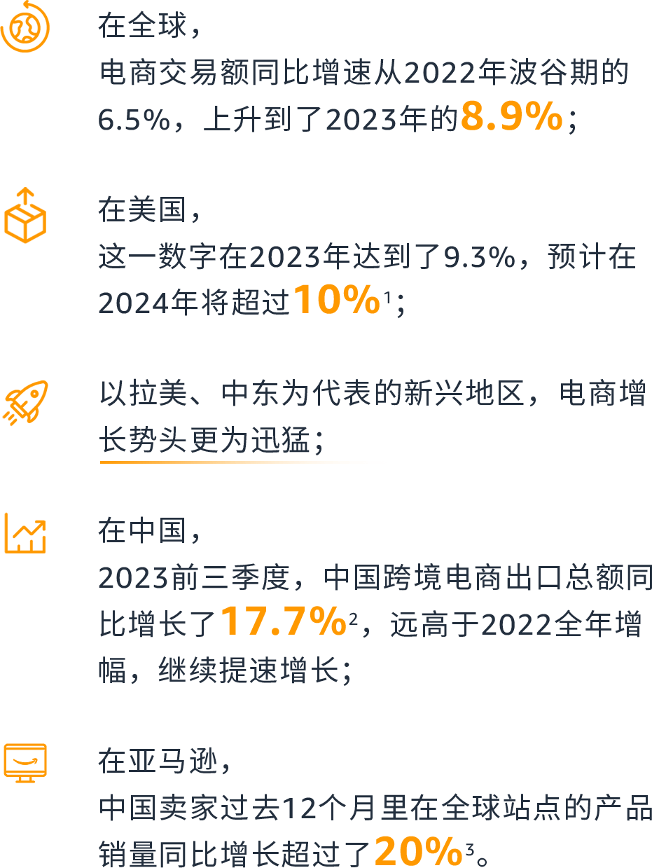 自2015年起,已经有数十万中国卖家通过亚马逊全球开店把产品远销海外。作为跨境电商崛起的参与者、见证者和领导者,我们有责任帮助卖家练就面向未来高质量出海的全方位能力,帮助他们积累品牌价值,建立发展的护城河,这也是我们2024年把战略重点聚焦在赋能品牌打造、简化全球运营、强化全球供应链解决方案、驱动全球拓展和提升本地服务背后的思考。