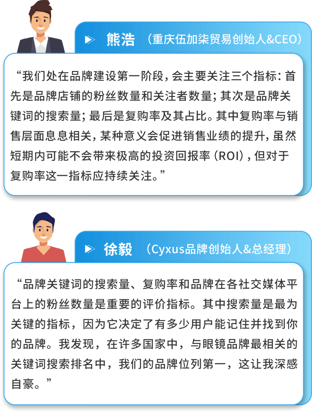 “品牌建设指标”所列出的这四大衡量指标,与中国品牌卖家的思路不谋而合。最近的品牌卖家调研反馈中,大部分被调研者也优选了这几项作为衡量品牌营销成功与否的关键。