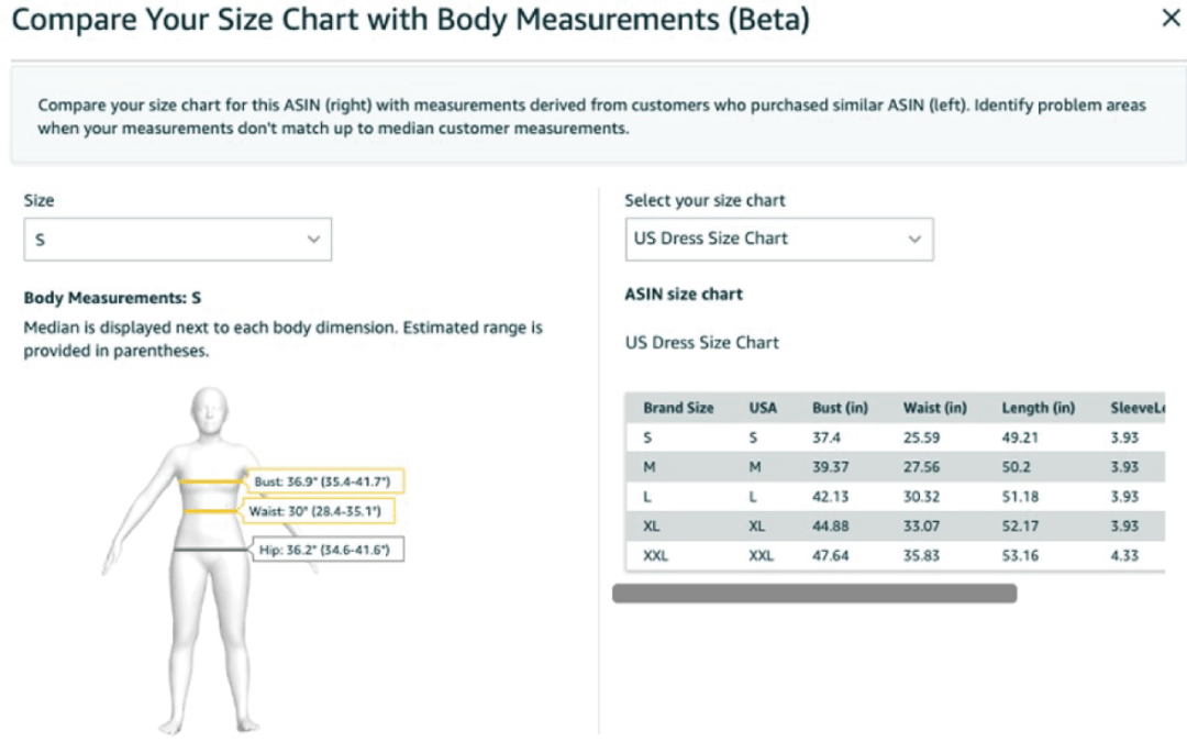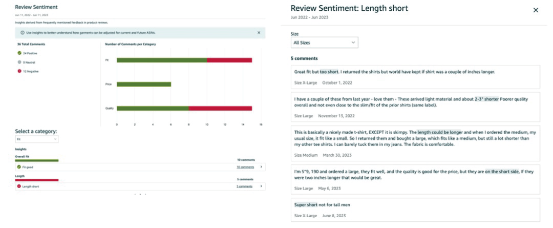 同样运用AI技术,Fit Insights Tool(FIT, 版型洞察工具)分析退货数据、尺码表以及关于尺码、质量和价格的顾客评价来帮助卖家识别和解决商品目录中的尺寸和适合度问题,精准洞察消费者的版型需求。