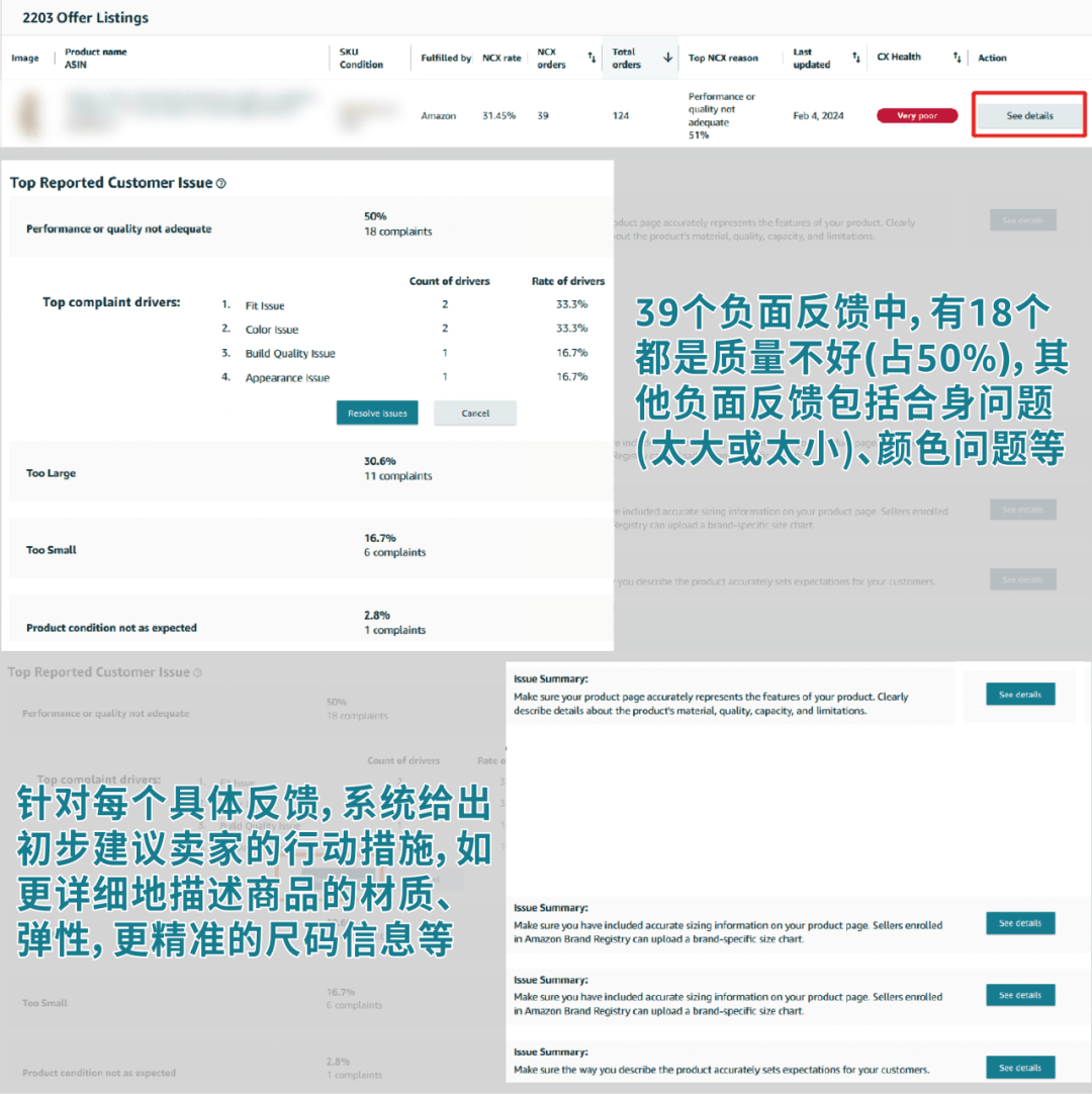 *NCX(Negative Customer experience)顾客负面体验,客户报告产品或listing问题的订单数量/总订单数量。亚马逊列出了退货、退款、客服联系、买卖双方信息、卖家反馈、A-Z索赔和产品评论等方面的客户反馈。