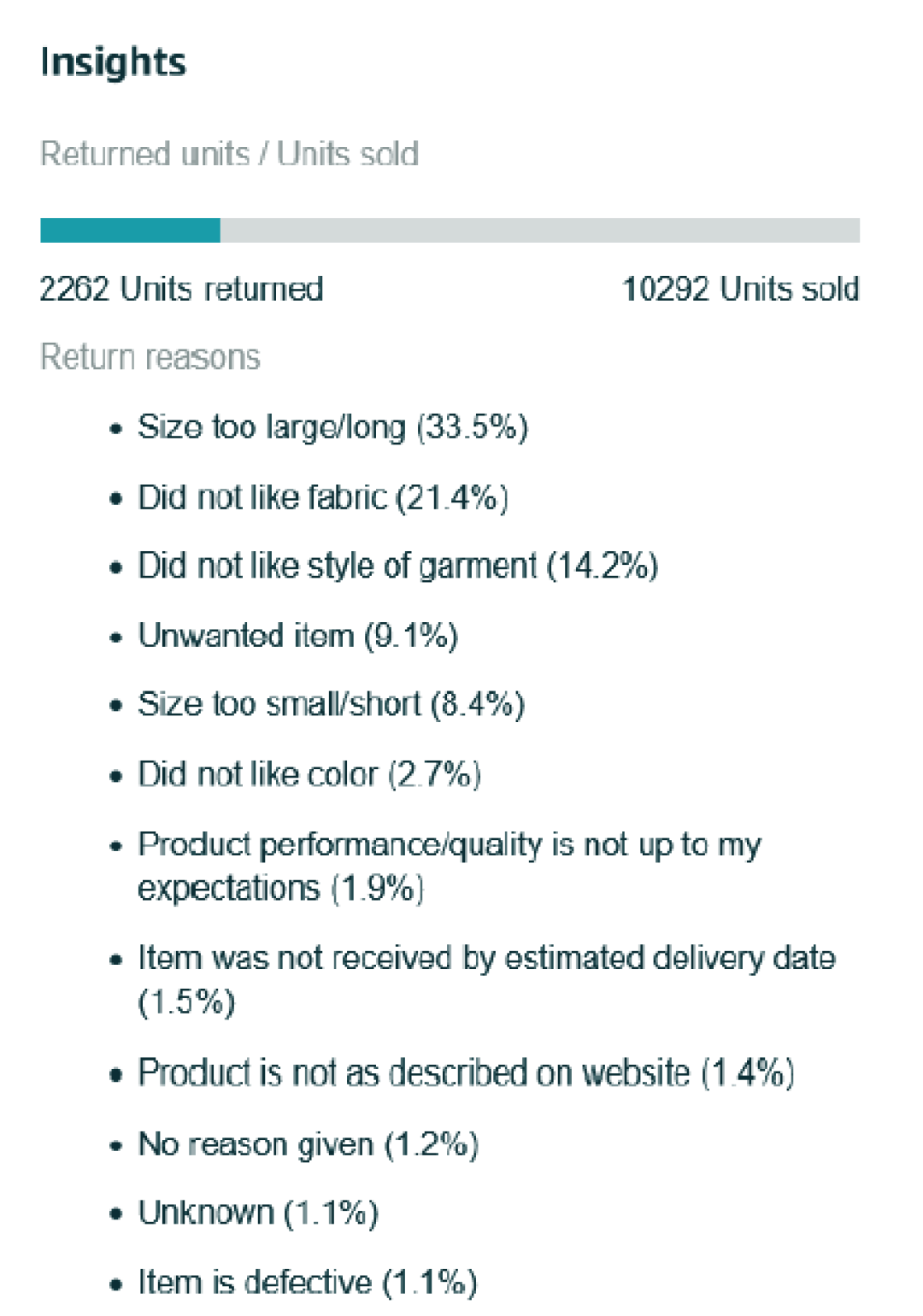 “带有不同颜色选项的退货健康分析非常有用。当我们登陆尺码洞察工具时,我们立即发现自己的退货情况非常糟糕。我们将深入研究每一款退货表现不好的商品。”