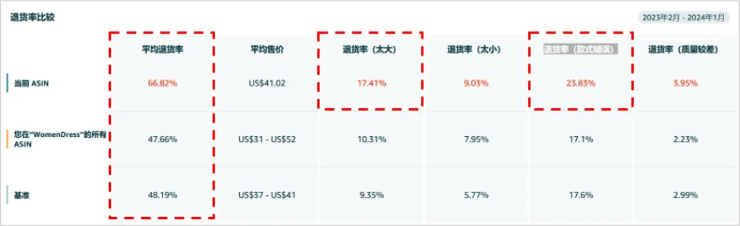 下图中的ASIN退货率明显高于同类ASIN平均表现,且退货原因主要集中在款式和尺码偏大问题上。