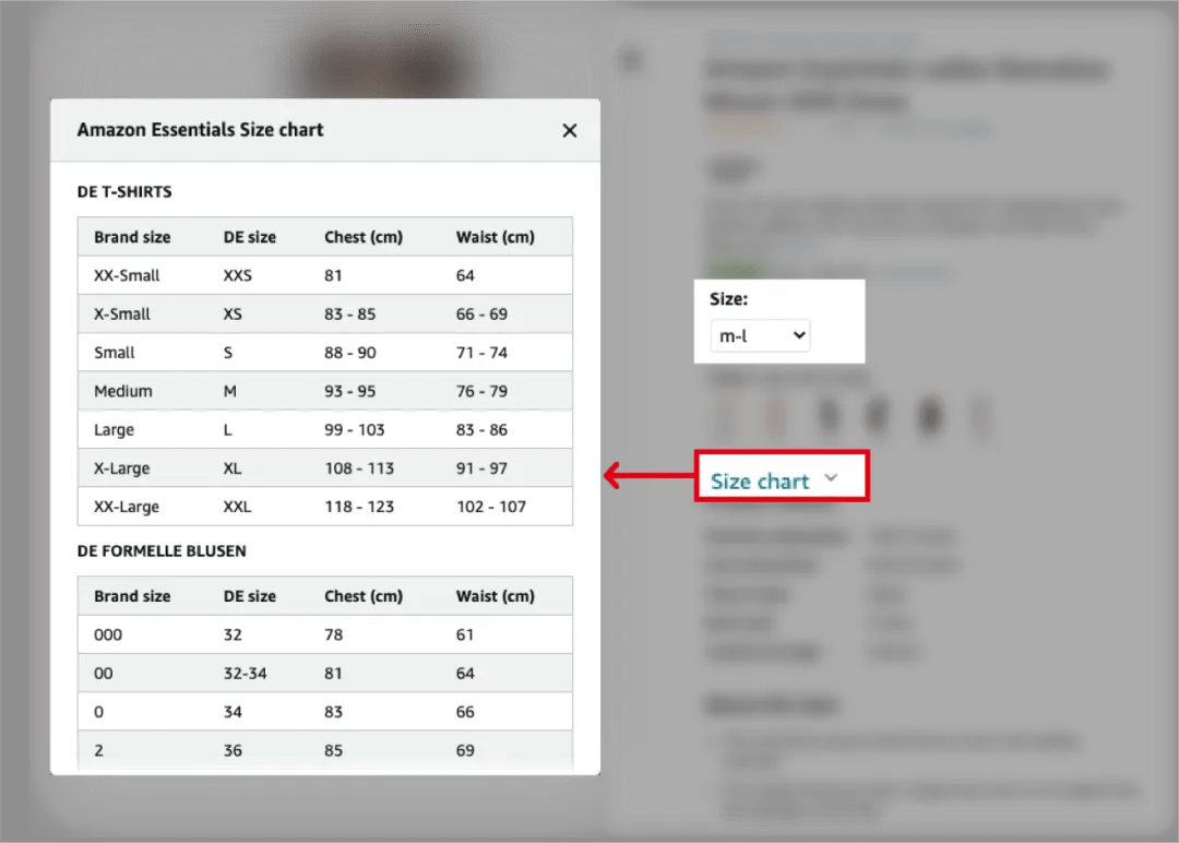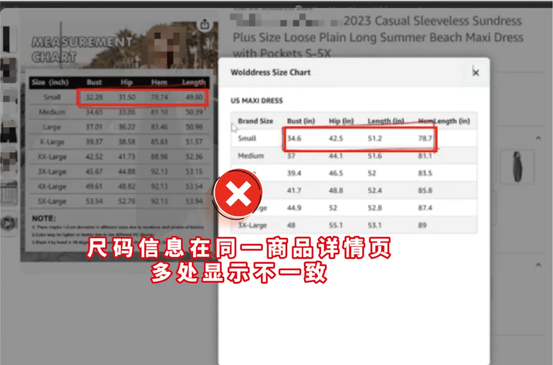 当消费者在同一个商品的下拉尺码表、尺码表图片、A+页面、产品详情中看到了不一样尺码信息时,将造成他们的购物困扰,也可能会导致后续退货的发生。