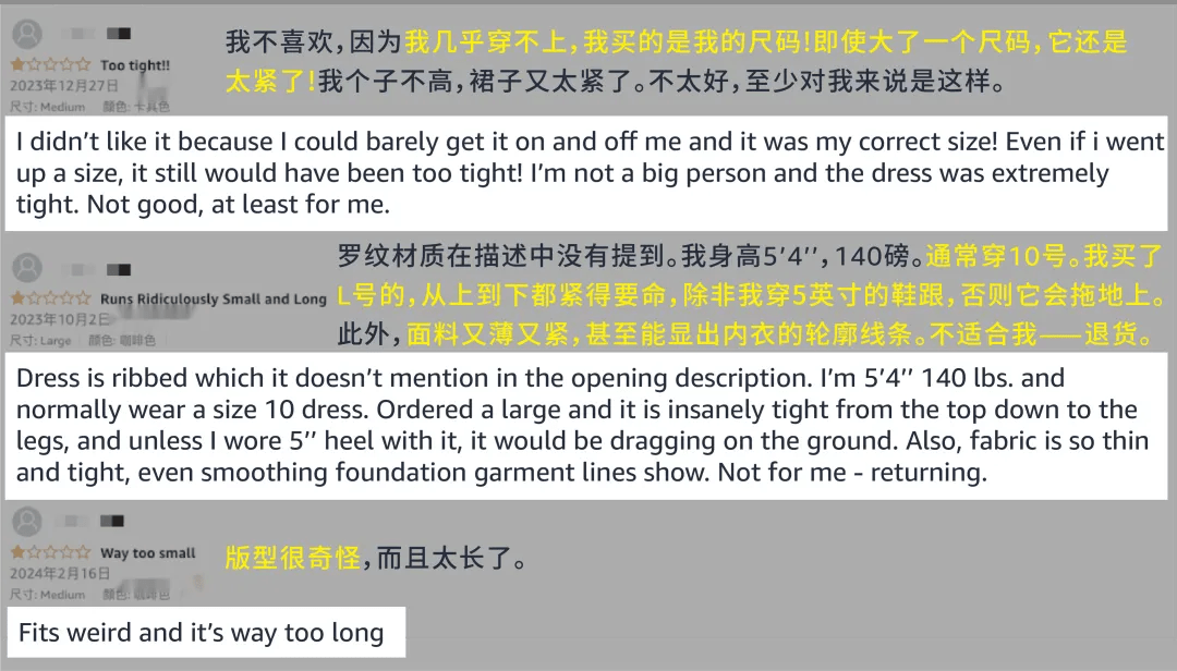 卖家可以查看的不仅是退货买家的评论,而是所有关于该单品的评价。能够更全面地了解包括尺码问题在内的各类负面反馈到底各占多少,大小问题还是颜色、质量问题,一目了然。