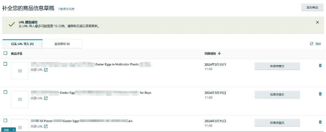 卖家在此页需要最多等待15分钟并可随时刷新页面追踪生成进度。也可以点击“添加商品”返回上一页,点击“查看我的商品信息草稿”重新进入预览页面。