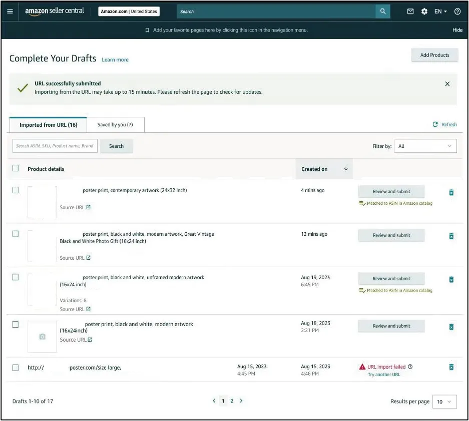 如果该商品已经在网络上有外部URL链接(例如,产品在外部网站上的详情页),卖家可输入网页链接,亚马逊 AI 将识别链接中的商品信息,生成全新的 Listing。