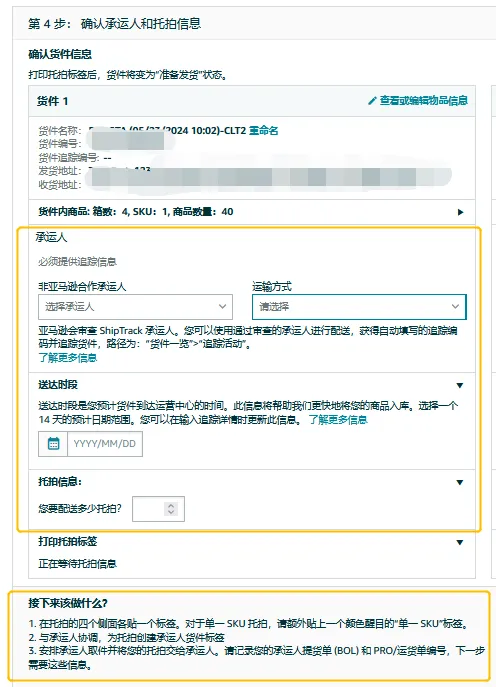如果使用托拍运送库存,需在这一步确认承运人和托拍信息。在托派信息中输入要配送的托拍数量,并在下一步点击打印托派标签后,将标签粘贴在托拍各侧面的中心和顶部附件。