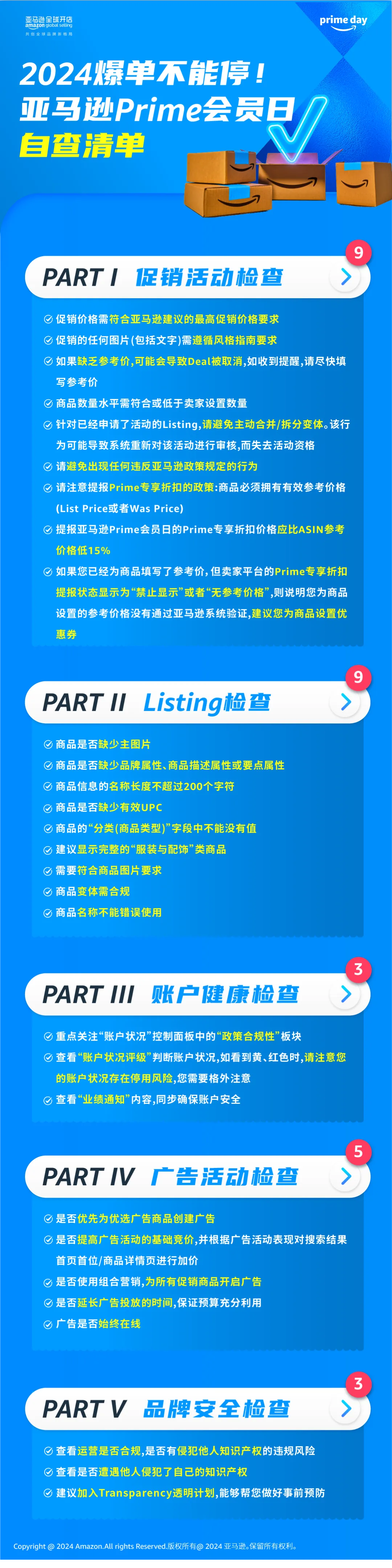 2024亚马逊Prime会员日进入最后冲刺,大促开跑前提醒各位卖家做好自查工作,特别是促销提报的查缺补漏,确保您的促销活动能够在大促期间顺利进行。