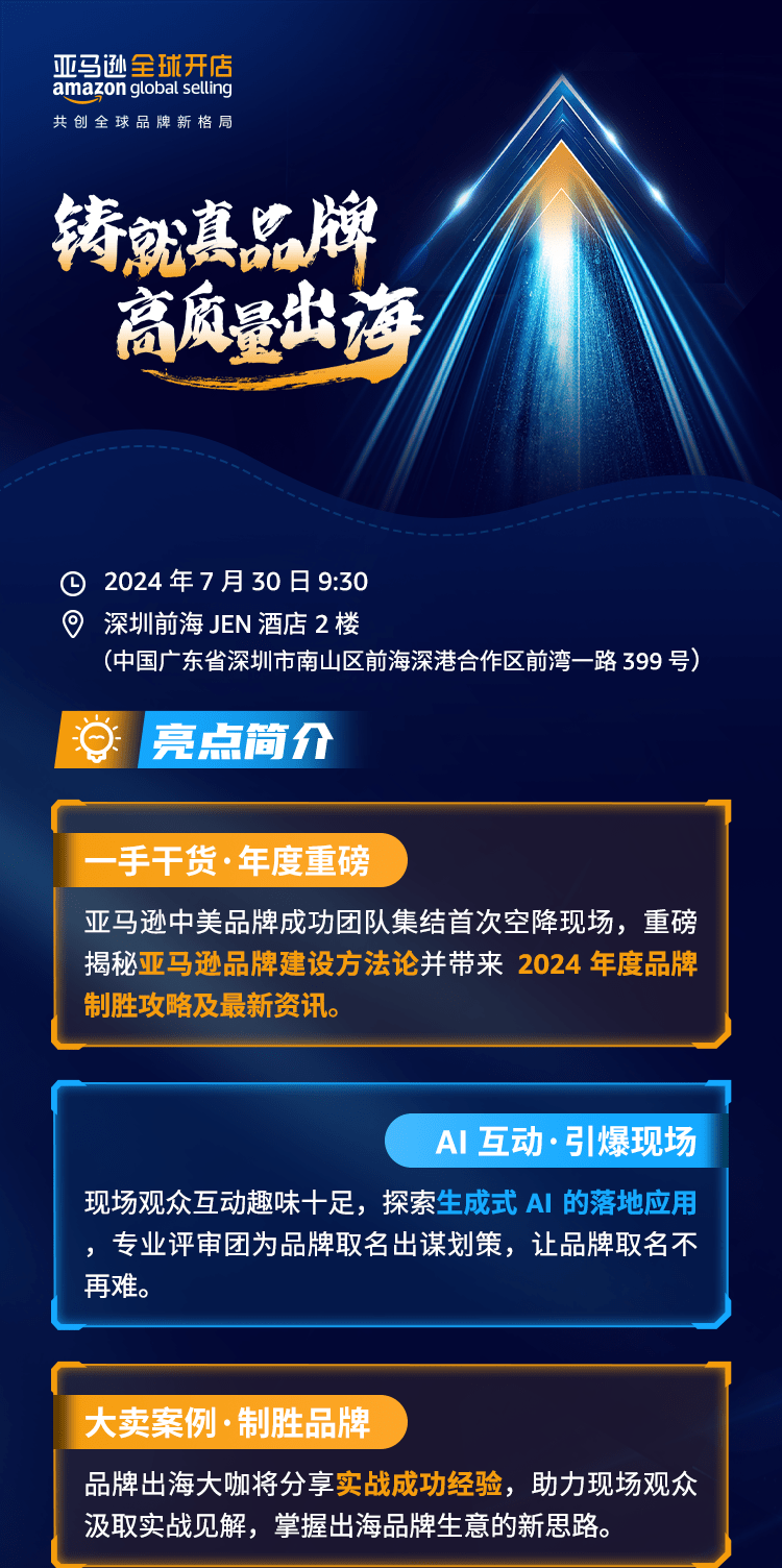 2024年7月30日,以“铸就真品牌,高质量出海”为主题的2024亚马逊全球开店品牌出海高峰论坛将于深圳市南山区前海JEN酒店盛大启幕,诚邀您参与!