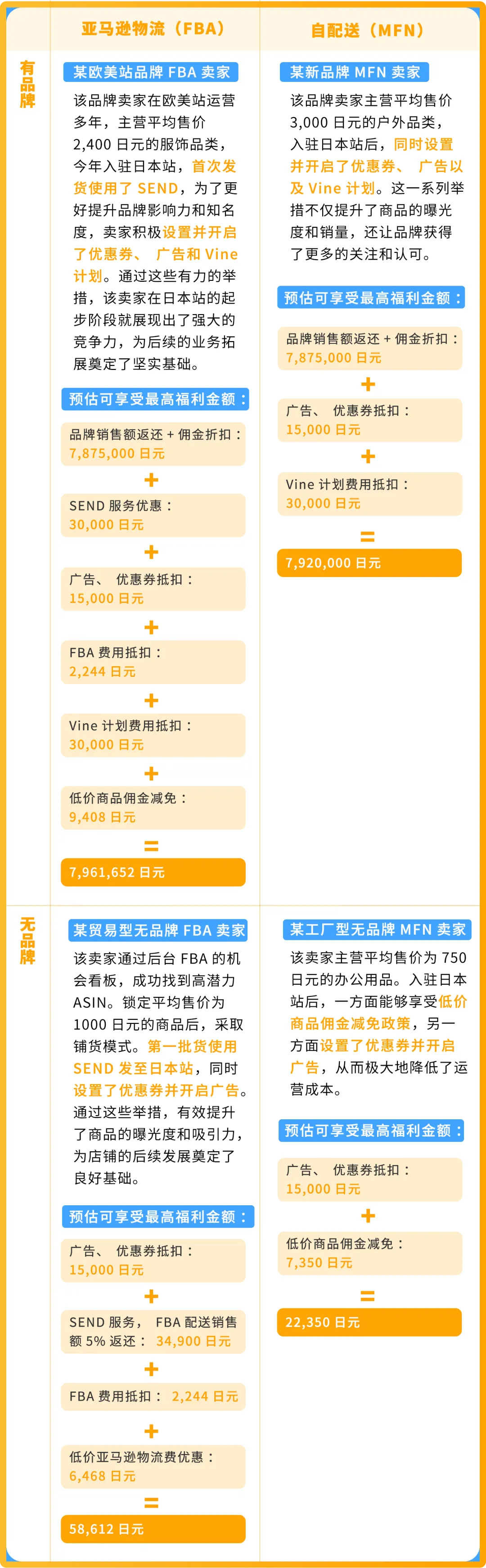 在完成以上步骤后就可以开卖啦!下面我们一起看看,在这个过程中,选择亚马逊物流(FBA)/自配送(MFN)的品牌/非品牌卖家,可以“薅”到多羊毛吧。