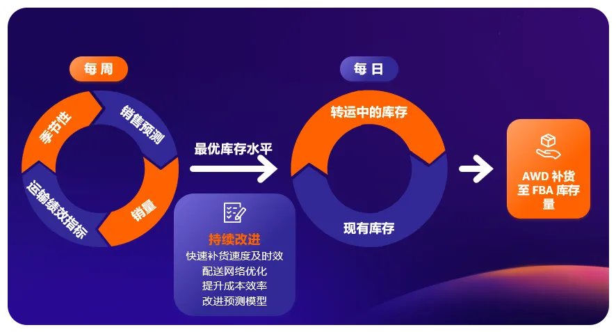 亚马逊利用先进的机器学习,通过两个模型支持自动补货。第一个模型基于数百万SKU多年历史数据来预测每个SKU的需求,涵盖了多维度的数据,例如季节性和高峰期数据。该模型为每个SKU确定最佳库存水平,使亚马逊能够为客户提供高效快速的配送。第二个模型会每日监测正在运往FBA的库存和已经在FBA中的库存,如果总量低于该SKU的最佳库存水平时,它就会触发AWD对FBA的及时补货,以确保您在目标销售区域保持充足库存。