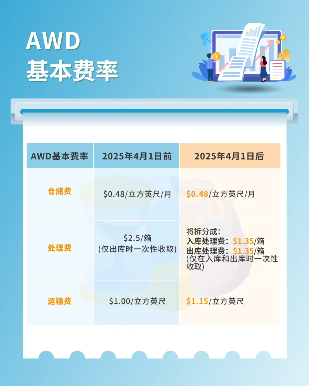 为进一步鼓励卖家使用AWD自动补货功能,提升库存管理效率,亚马逊将于2025年4月1日(太平洋时间)起推出AWD费率新政。