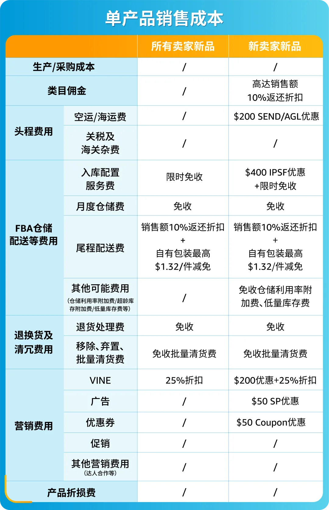 在了解了成本构成后,我们来看看新品测试阶段,亚马逊都推出了哪些福利~以美国站为例,不同站点可能有差异,以卖家平台列出的信息为准。