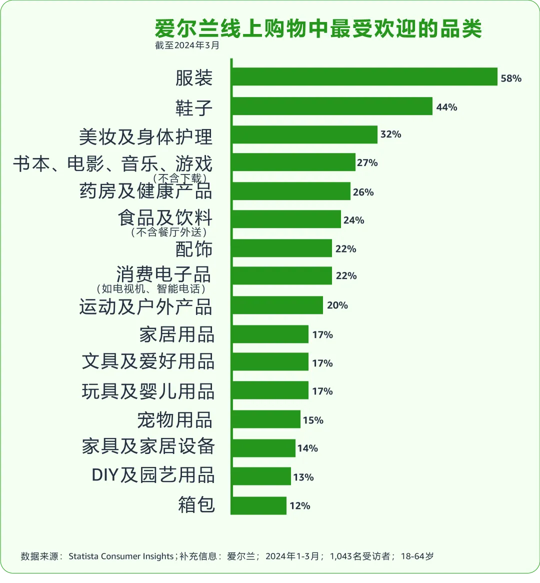 时尚类目、电子产品及健康个护等是爱尔兰消费者电商购物的热门选品7/8