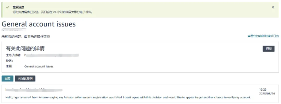 ● 在您成功发送申诉请求之后,您会收到一封来自亚马逊的邮件,通知您已经创建了一个新的案例(Case)。后续您可以重新登录此页面或者检查您的邮箱查看是否收到来自“卖家支持”团队的回复。