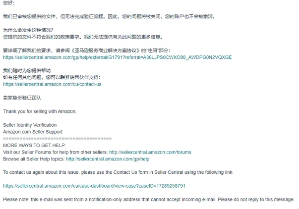 ● 如果您的申诉请求未被接受,您可能会收到一封来自亚马逊的邮件,告知您“我们已经审核您提供的文件,但无法完成验证流程”。如果您对结果有异议,请您继续联系“卖家支持”团队或者您的客户/账户经理进行下一步了解。