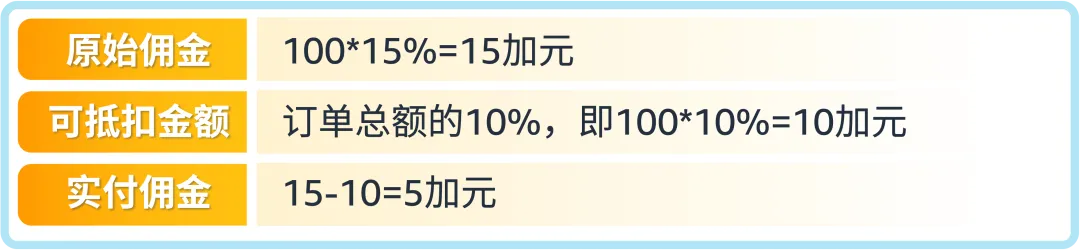 订单示例:100加元订单, 销售佣金15% (佣金比例取决于类目)