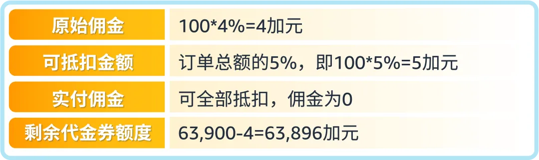 订单示例:Adam品牌销售额达到了70,200加元,还剩63,900加元的代金券可用, 这时收到一笔100加元的订单,销售佣金4%