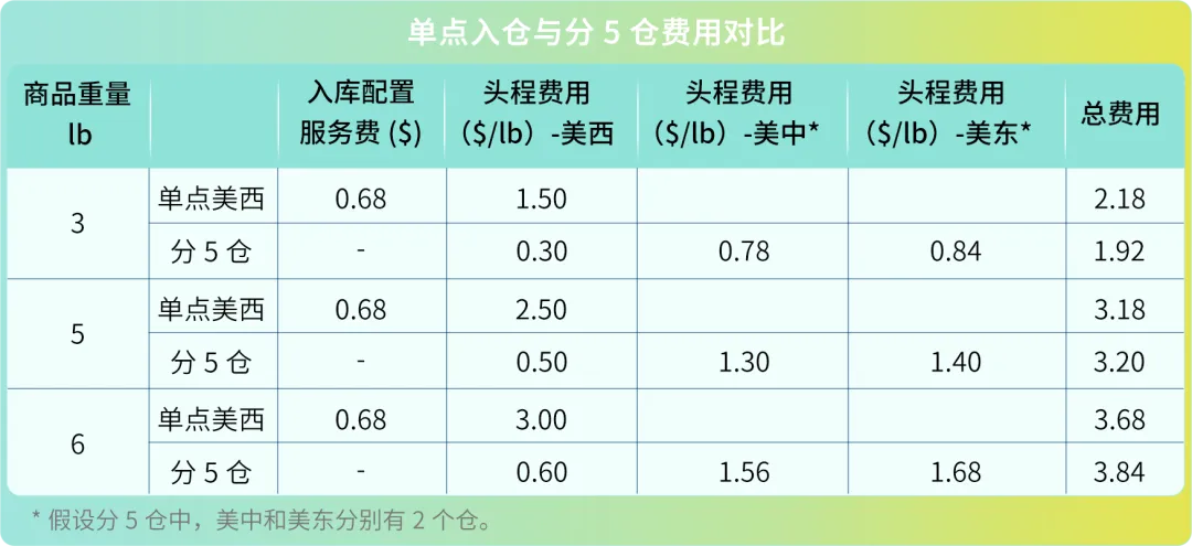 建议卖家要综合比较一下入库综合费用,其中包括入库配置服务费和头程费用。您可以针对不同重量的商品分别计算单点入仓和分5仓的总费用,对比一下哪个更划算。