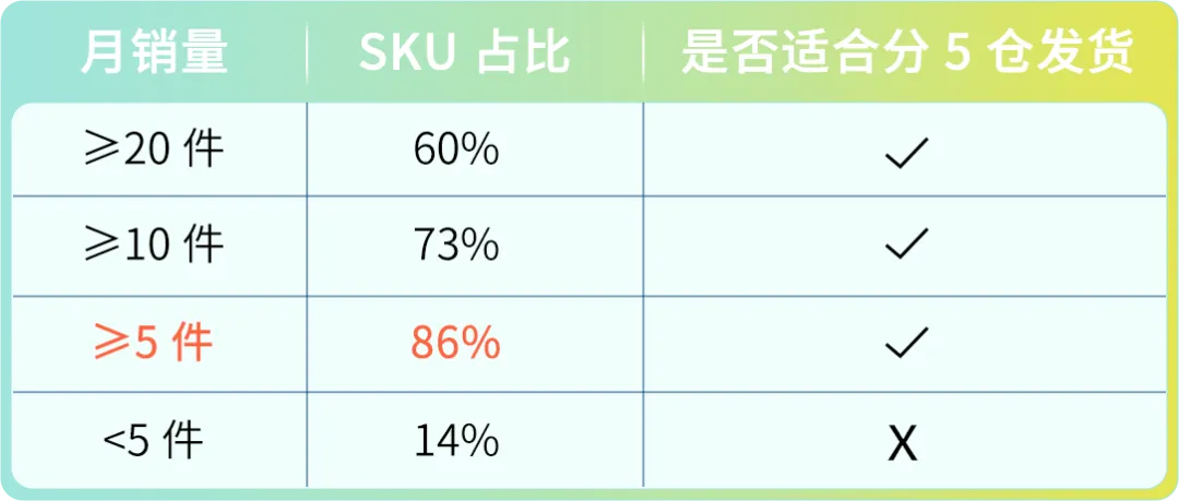 ● 分5仓更划算的话,找出月销量≥5件的SKU占比,通过发5仓省下入库配置服务费。