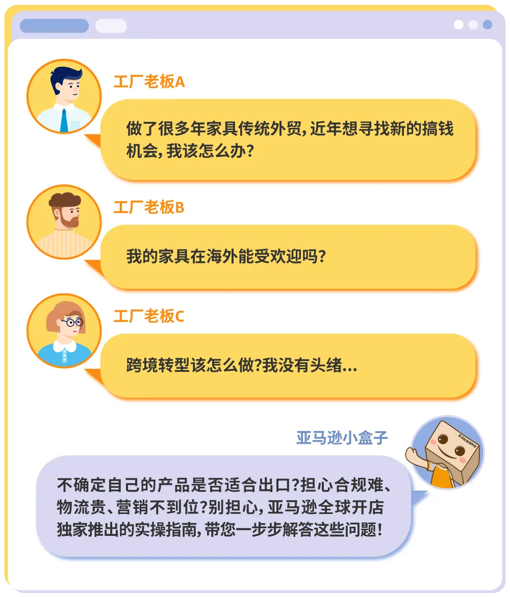 听说很多家具工厂老板正在面临转型难题,想在跨境电商领域找到新机会,但不知道从哪里入手?《亚马逊全球开店家具工厂转型跨境指南》来帮您!指南内含详细步骤,领取二维码就在下方!本文更是为各位家具工厂老板精选了指南亮点内容,一起往后看看吧!