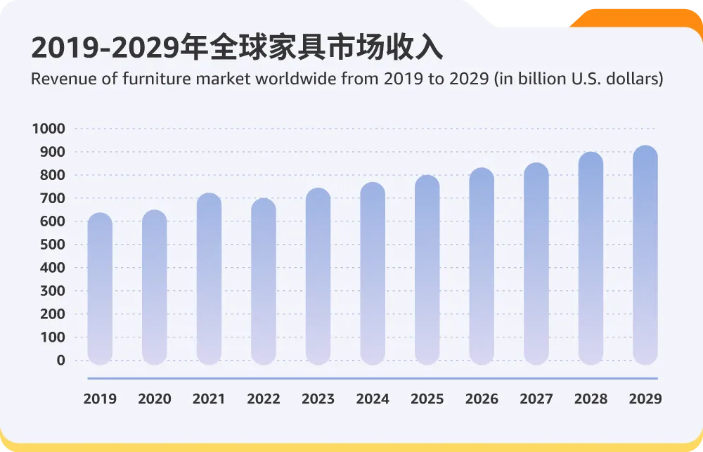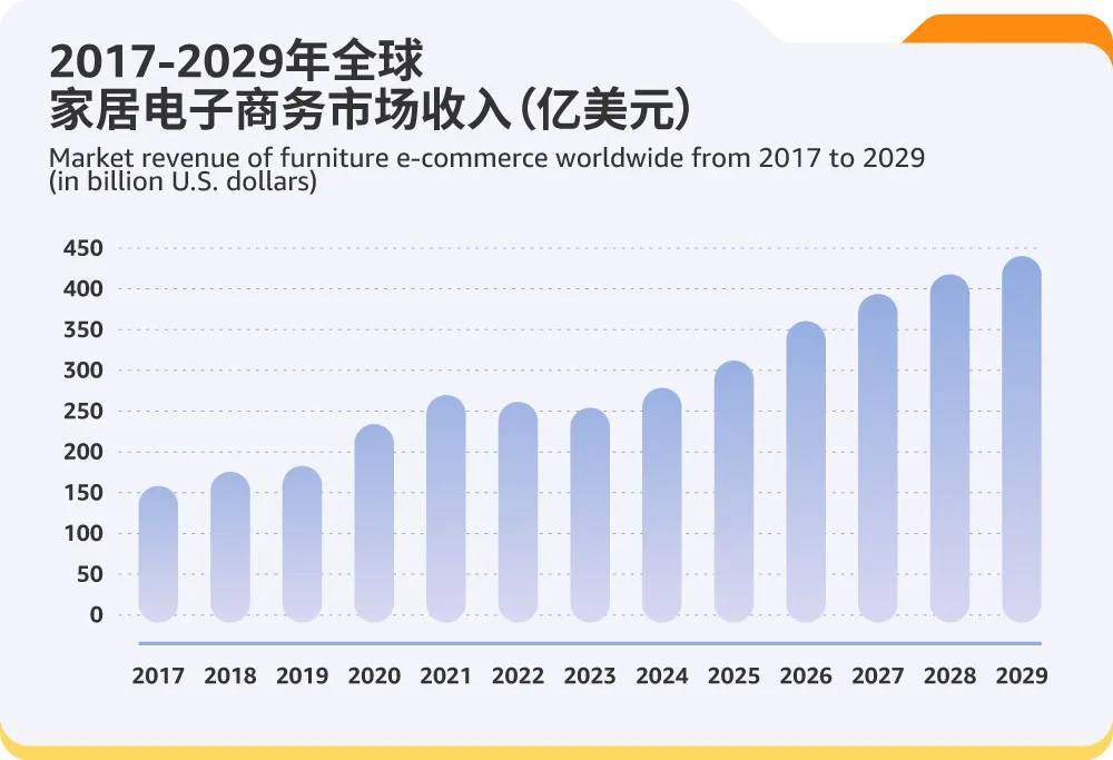 2025年海外消费者对高质量家具的需求将激增!家具品类规模,预计在2025年将突破8,000亿美元!线上渗透率持续提升,预计2025年全球家具品类规模将达到3,185亿美元,年均增速超过12%,到2029年将突破4,360亿美元。