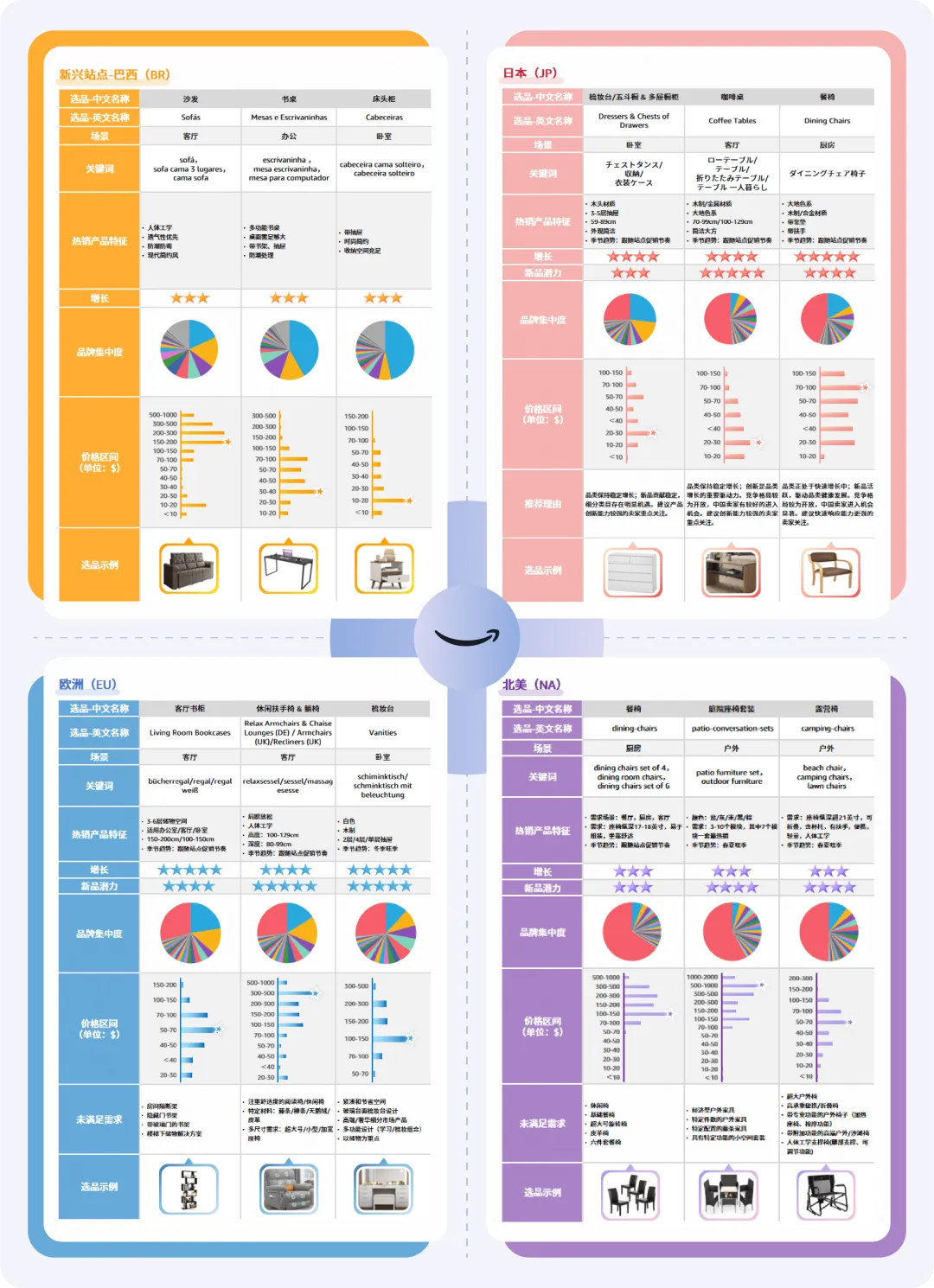 《亚马逊全球开店家具工厂转型跨境指南》首次收录美、欧、日及新兴站点的家具选品数据,更有详细产品特征帮助各位卖家进行产品机遇洞察,打造差异化选品。