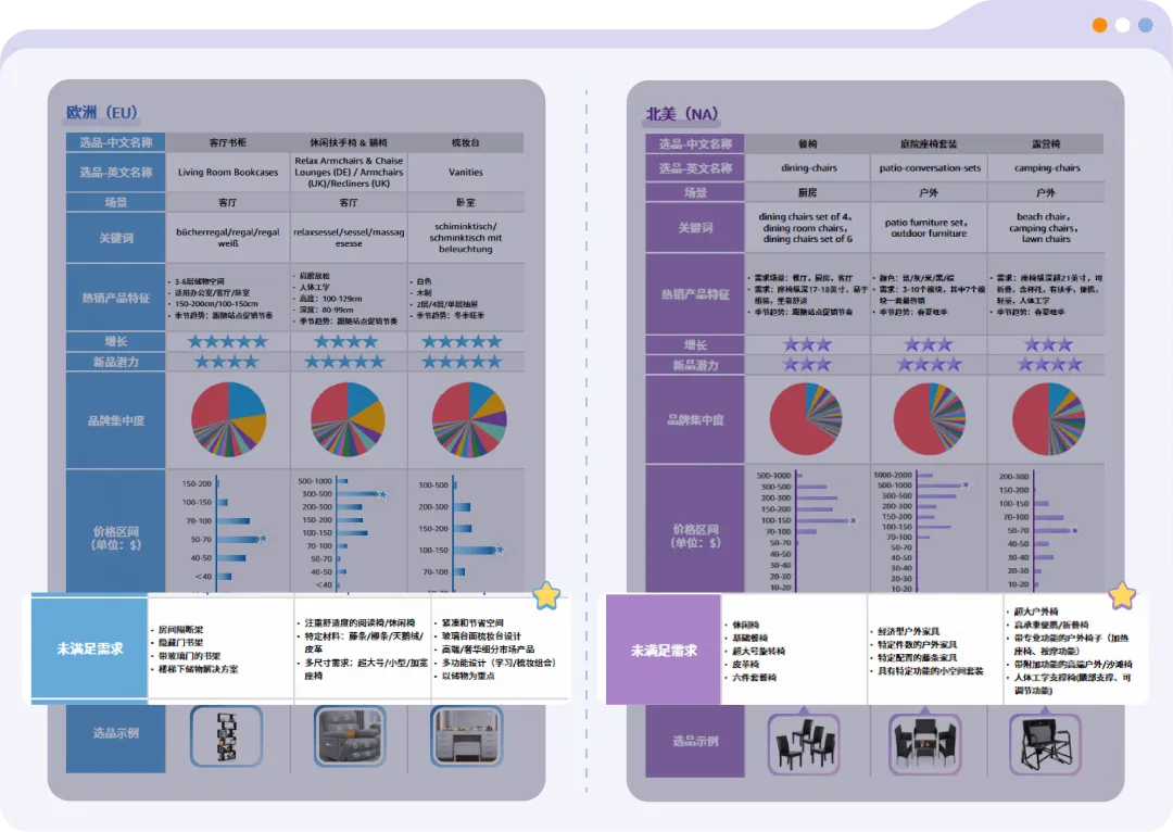 例如当前美欧站点上对于环保、可持续家具的需求正在激增,而现有产品供应并未完全覆盖这些偏好。一些以生产环保钢木制产品为主的家具工厂,现在正迎来进入这一类目的最佳时机!这些“未满足需求”等待各位工厂老板提前锁定商机!