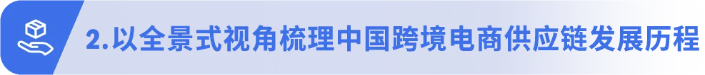 基于行业发展沿革,《报告》全景梳理中国跨境电商供应链从“运”、“仓”、“配”到“链网”四大阶段发展历程,深刻揭示了供应链从单一的物流支持角色,质变跃迁为驱动全链路高效协同的核心服务枢纽。
