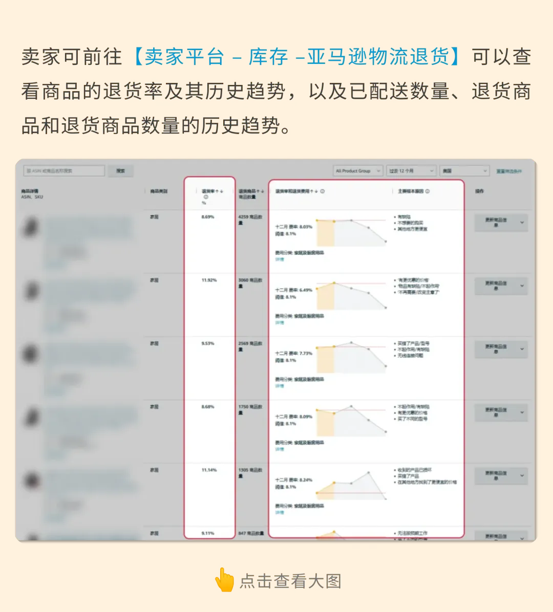 适用于高退货率的商品,展现详尽的FBA退货商品数据,帮助卖家明确商品的优化方向。