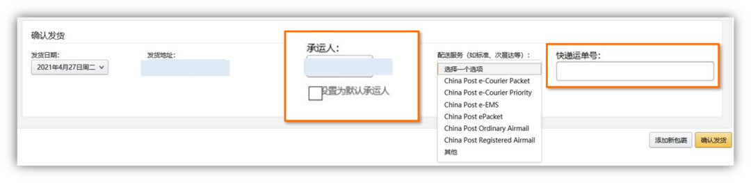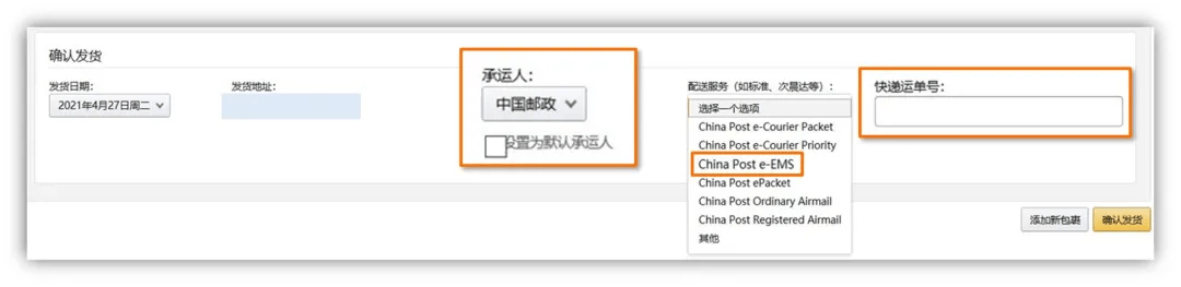 例如:使用中国邮政的e-EMS服务发货。则在“承运人”下拉菜单中选择“中国邮政”,在“配送服务”下拉菜单中选择“China Post e-EMS”,并提供正确的快递运单号。